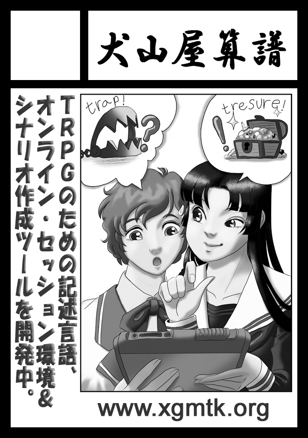 TRPGでGMとプレイヤーを支援するツール、オンラインセッション環境、ルールとシナリオの記述言語、オーサリング・ツールを開発中。汎用だが当面はRuneQuestをサンプルとする予定。今回の新刊は「XGMTKプロジェクト概説」(改訂版)です。プロジェクト概説の以前の版はアイディアメモっぽい側面が残っていたのを利用者視点で特徴を整理します。